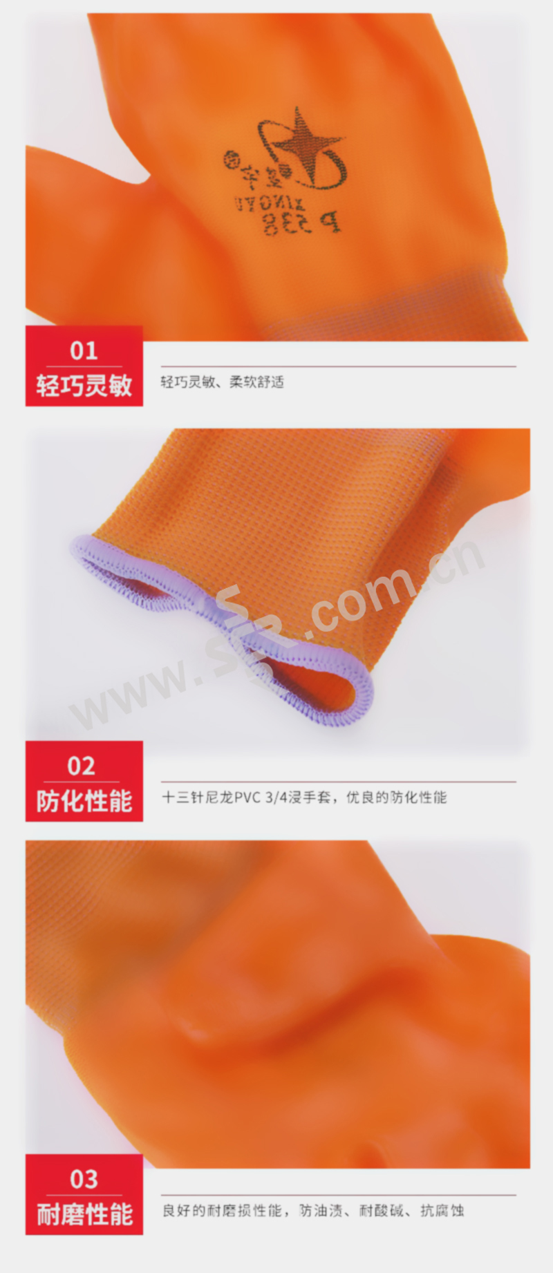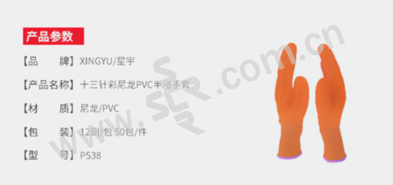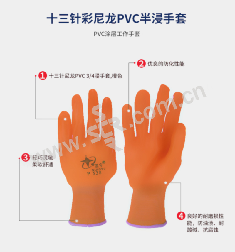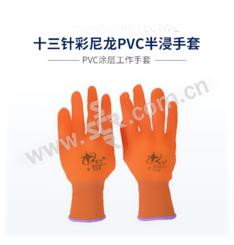 XINGYU/星宇 十三针彩尼龙PVC半浸手套 P538 M(均码) 橘色 1副