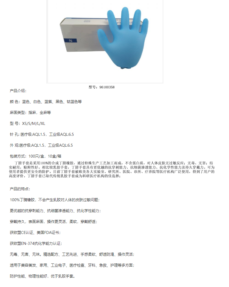 ·选用优质丁腈合成橡胶制成,抗过敏,耐刺穿 ·无粉、无毒、无害、无味 ·亲肤舒适,有效地抵御细菌渗透 ·局部或全部麻面防滑设计使得操作更灵活