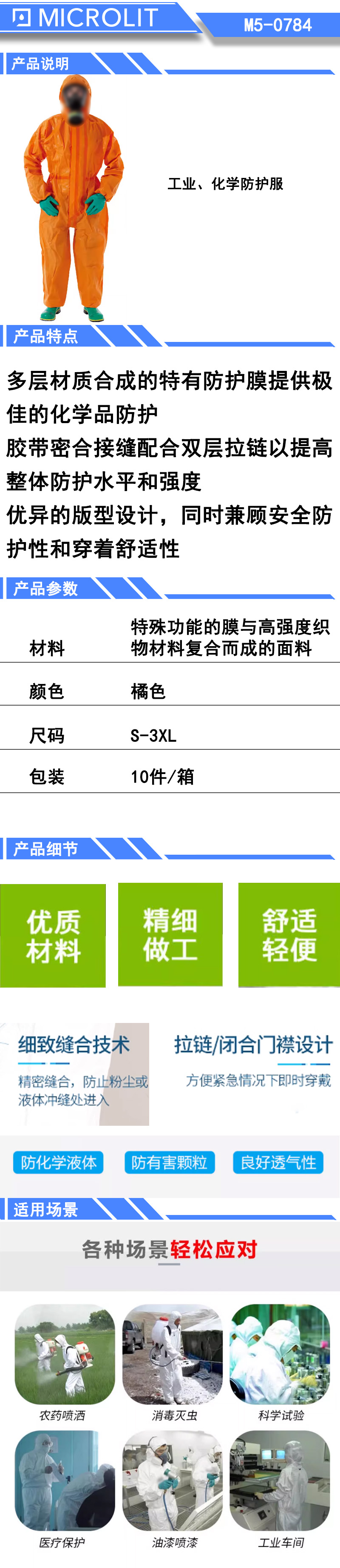 * 多层材质合成的特有防护膜提供极佳的化学品防护; * 胶带密合接缝配合双层拉链以提高整体护水平和强度; * 优异的版型设计,同时兼顾安全防护性和穿着舒适性。