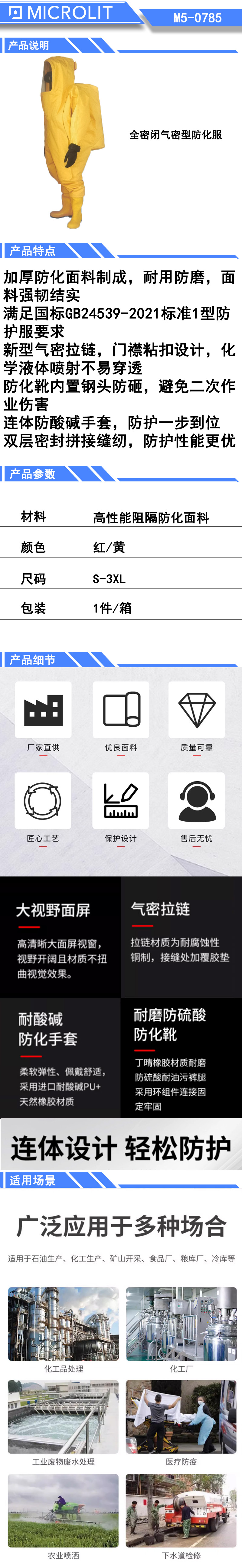 * 加厚防化面料制成,耐用防磨,面料强韧结实; * 满足国标GB24539-2021标准1型防护服要求; * 新型气密拉链,门襟粘扣设计,化学液体喷射不易穿透; * 防化靴内置钢头防砸,避免二次作业伤害; * 连体防酸碱手套,防护一步到位; * 双层密封拼接缝纫,防护性能更优。