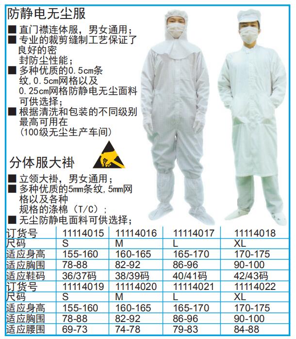 ·直门襟连体服,男女通用; ·专业的裁剪缝制工艺保证了良好的密封防尘性能; ·多种优质的0.5cm条纹,0.5cm网格以及0.25cm网格防静电无尘面料可供选择; ·根据清洗和包装的不同级别最高可用在(100级无尘生产车间) ·立领大褂,男女通用;多种优质的5mm条纹,5mm网格以及各种规格的涤棉(T/C)