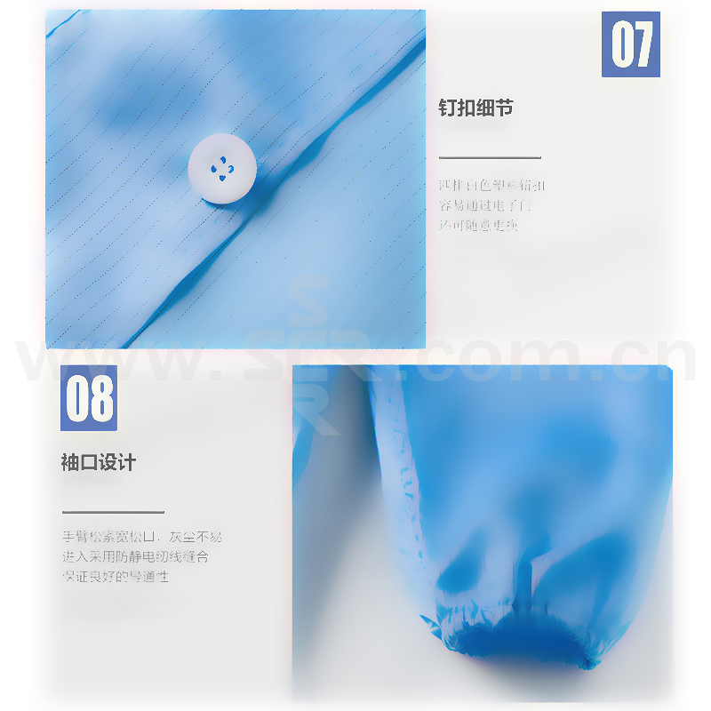 ·防静电无尘服面料本身不发尘、不粘尘、阻隔性好、高密度、高强度