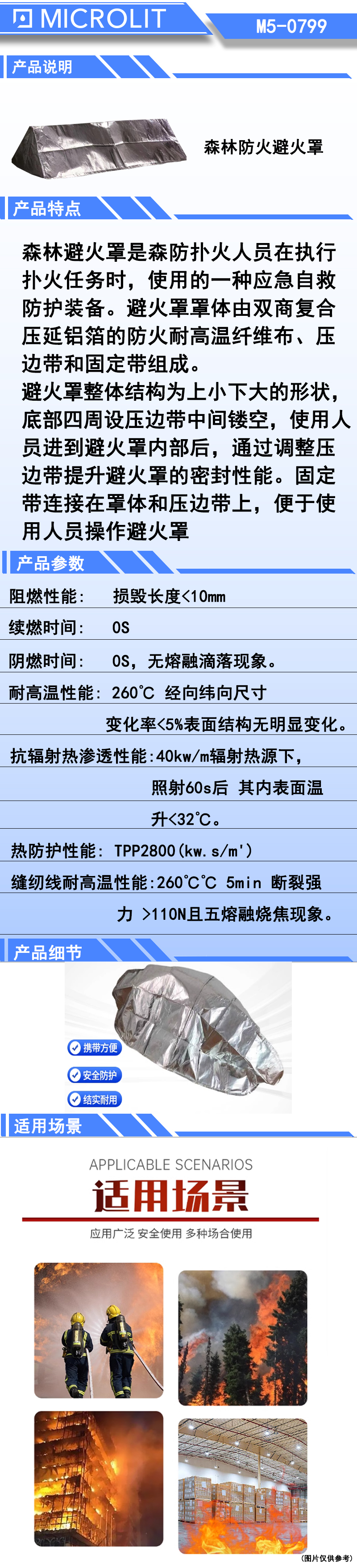 森林避火罩是森防扑火人员在执行扑火任务时使用的一种应急自救防护装备。避火罩罩体由双面复合压延铝箔的防火耐高温纤维布、压边带和固定带组成。 避火罩整体结构为上小下大的形状,底部四周设压边带中间镂空,使用人员进到避火罩内部后,通过调整压边带提升避火罩的密封性能。固定带连接在罩体和压边带上,便于使用人员操控避火罩。