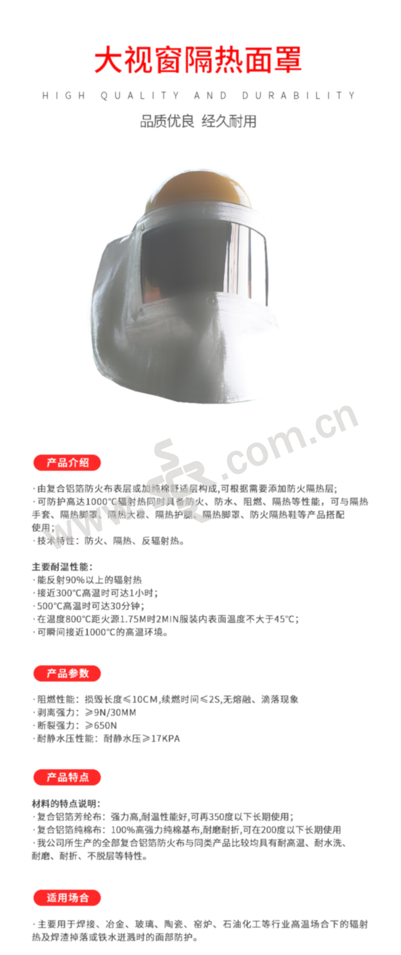·可防护高达1000℃辐射热同时具备防火、防水、阻燃、隔热等性能,可与隔热手套、隔热脚罩、隔热大襟、隔热护腿、隔热脚罩、防火隔热鞋等产品搭配使用