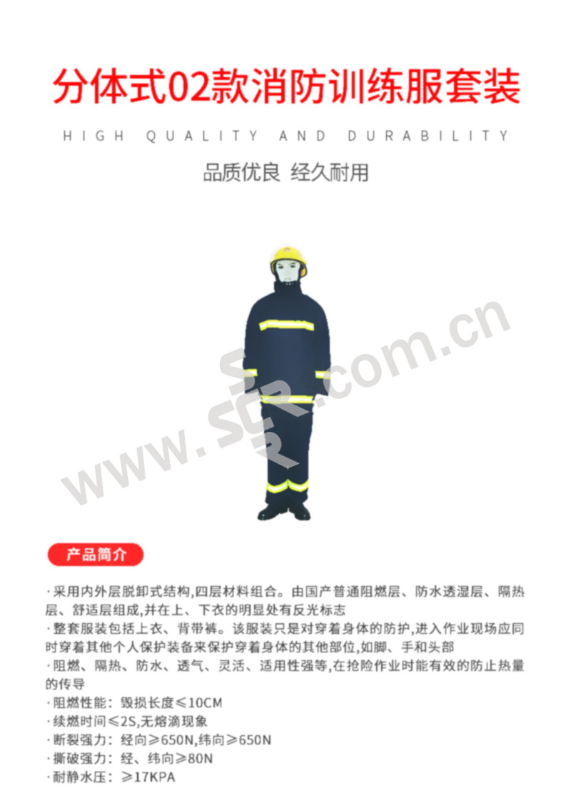 ·采用内外层脱卸式结构,四层材料组合。由国产普通阻燃层、防水透湿层、隔热层、舒适层组成,并在上、下衣的明显处有反光标志·整套服装包括上衣、背带裤。该服装只是对穿着身体的防护,进入作业现场应同时穿着其他个人保护装备来保护穿着身体的其他部位,如脚、手和头部·阻燃、隔热、防水、透气、灵活、适用性强等,在抢险作业时能有效的防止热量的传导·阻燃性能:毁损长度≤10cm·续燃时间≤2S,无熔滴现象·断裂强力:经向≥650N,纬向≥650N·撕破强力:经、纬向