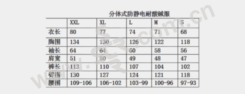 ·由可防静电的面料所制成,该面料纱线含一定比例的导电丝,其导电丝是由一定比例的不锈钢纤维与普通纤维混纺制成,因此,由他织成的防静电布料的导电性能稳定,不随衣服的洗涤次数而变化·上装为夹克式,下装为直筒裤·产品符合GB 12014-2009防静电服要求