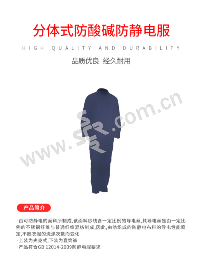 ·由可防静电的面料所制成,该面料纱线含一定比例的导电丝,其导电丝是由一定比例的不锈钢纤维与普通纤维混纺制成,因此,由他织成的防静电布料的导电性能稳定,不随衣服的洗涤次数而变化
