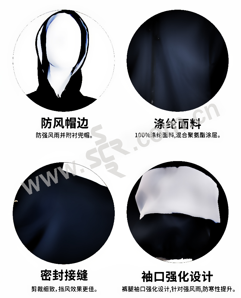 ·PVC内涂层,内置防风挡片,腋下透气设计,轻便实用