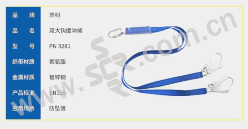 ·安全带套装·44毫米双色聚酯材质颜色醒目,便于检查·所有金属部件均使用镀锌钢材质,更耐腐蚀·胸带和跨带可根据用户需求进行调节·背部D型环,可用于防坠落·双头缓冲绳由44毫米宽蓝色聚酯材料制成·长度(含安全钩):1.8米,缓冲包展开长度:1.2米·缓冲带两端织带环上有保护套,延长使用寿命·冲击作用力峰值小于6KN·两端分别配有镀锌钢安全钩和两个脚手架安全挂钩