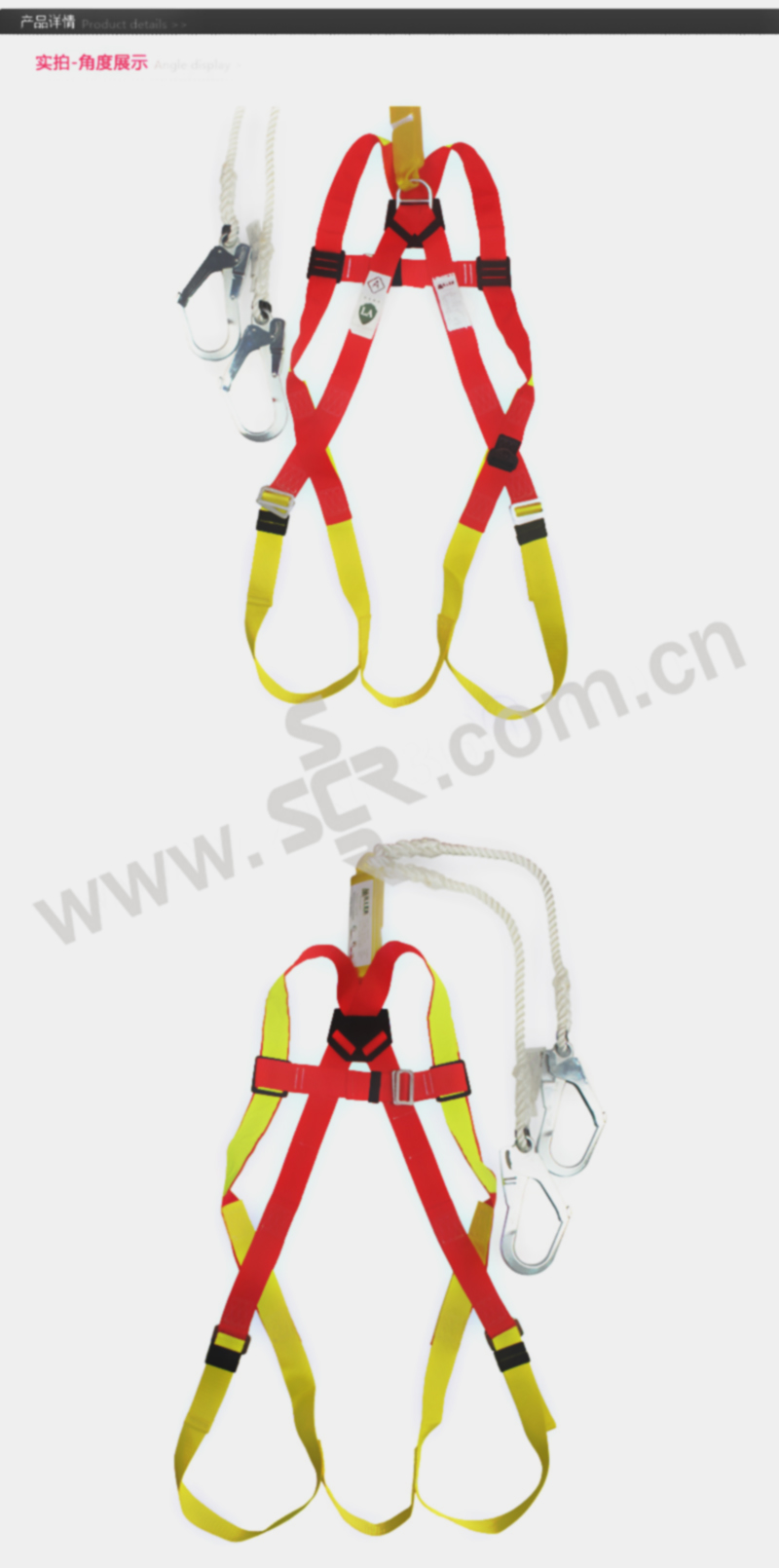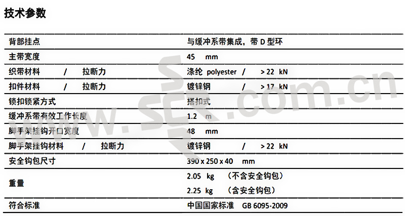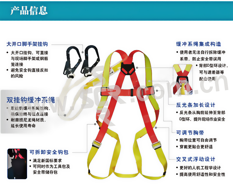 · DL-C2 集成式全身式安全带· 配有1.2米双叉缓冲系绳和2 个脚手架挂钩· 双叉缓冲系绳集成构造· 胸带位置可上下调节· 2 个大开口脚手架挂钩· 胸部反光条· 可拆卸安全钩包· 符合标准:GB6095