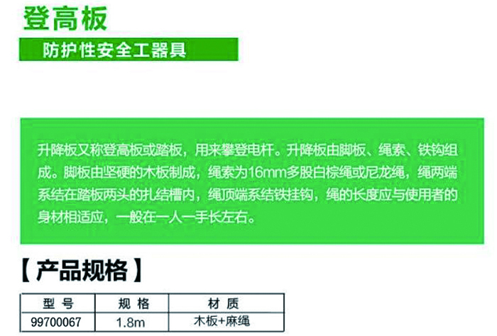·升降板由脚板,绳索,铁钩组成,脚板由坚硬的木板制成,绳索为16mm多股白棕绳或尼龙绳,绳两端系结在踏板两头的扎结槽内,绳顶端系结铁挂钩,绳的长度应与使用者的身材相话应,一般在一人一手长左右