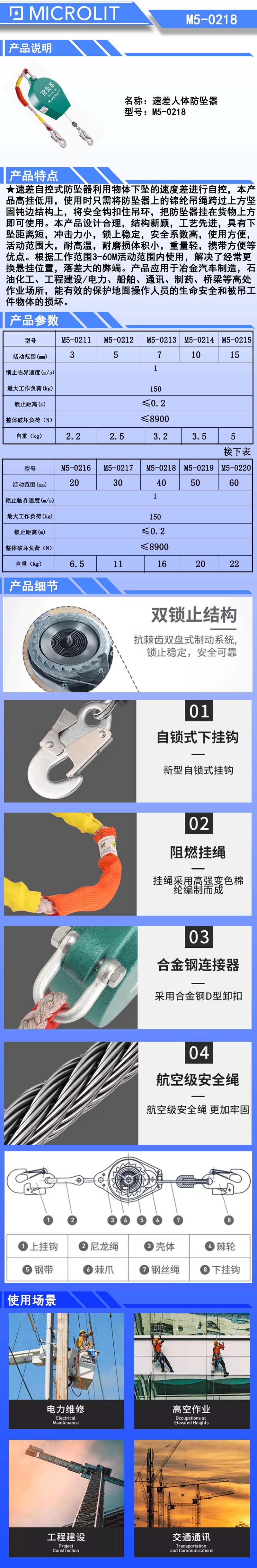 速差自控式防坠器利用物体下坠的速度差进行自控,本产品高挂低用,使用时只需将防坠器上的锦纶吊绳跨过上方坚固钝边结构上,将安全钩扣住吊环,把防坠器挂在货物上方即可使用。本产品设计合理,结构新颖,工艺先进,具有下坠距离短,冲击力小,锁上稳定,安全系数高,使用方便,活动范围大,耐高温,耐磨体积小,重量轻,携带方便等优点。根据工作范围3-64M活动范围内使用,解决了经常更换悬挂位置,落差大的弊端。产品应用于冶金汽车制造,石油化工、工程建设/电力、船舶、通讯、制药、桥梁等高处作业场所,能有效的保护地面操作人员的生命安全和被吊工件物体的损坏。