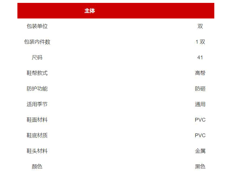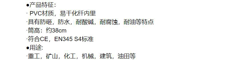 ·PVC材质,易干化纤内里 ·具有防砸,防水,耐酸碱,耐腐蚀,耐油等特点 ·筒高:约38cm ·符合CE,EN345S4标准
