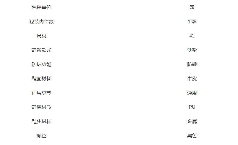 ·优质压花水牛皮鞋面,皮革厚度1.6~1.8mm ·聚氨酯(PU)注塑鞋底 ·优质BK布内里,透气 ·EVA鞋垫 ·非封闭鞋舌 ·舒适轻便、防砸、耐磨、耐油 ·符合国标 ·重量900g