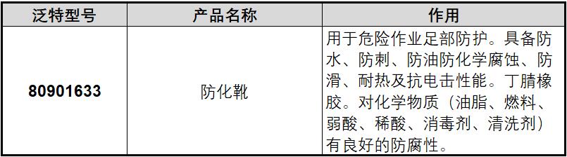 ·用于危险作业足部防护。具备防水、防刺、防油防化学腐蚀、防滑、耐热及抗电击性能。丁腈橡胶。对化学物质(油脂、燃料、弱酸、稀酸、消毒剂、清洗剂)有良好的防腐性。