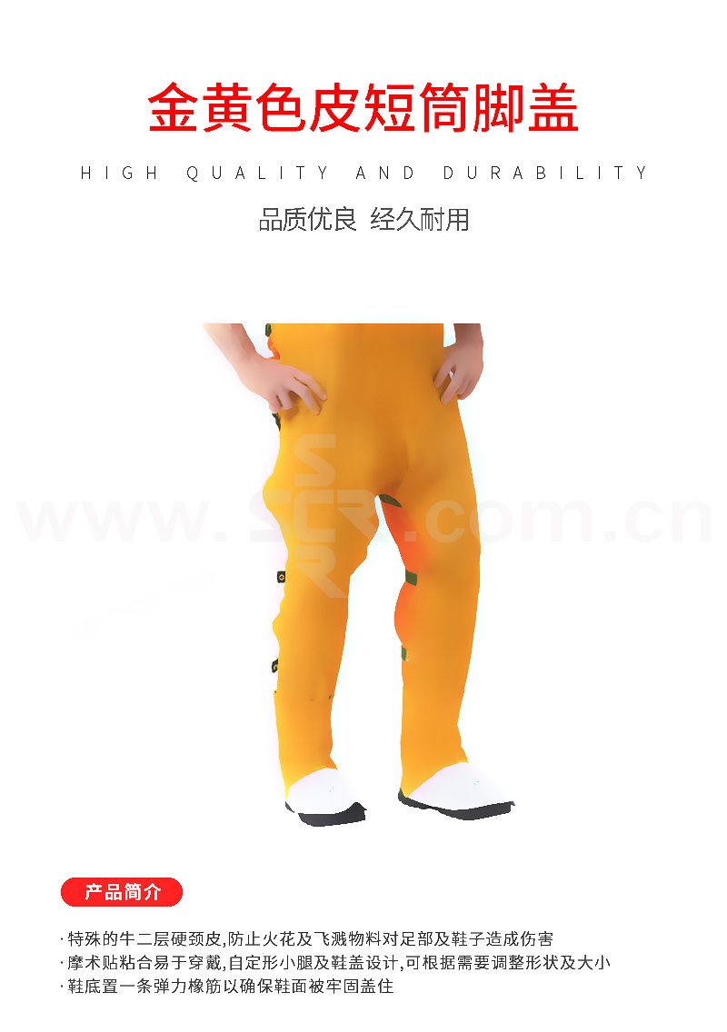 ·特殊的牛二层硬颈皮,防止火花及飞溅物料对足部及鞋子造成伤害
