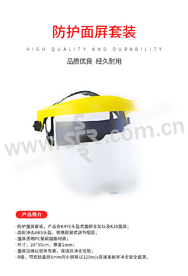 ·防护面屏套装,产品含K4YE头盔式面屏支架以及K28面屏·高耐冲击ABS头盔,使用简易式调节帽圈·面屏透明PC聚碳酸酯材质·尺寸:20*30cm,厚度1mm·面屏边缘以铝条包裹,增强抗冲击性能·B级,可抵抗直径6mm的小钢珠以120m/s高速发射并冲击安全面罩
