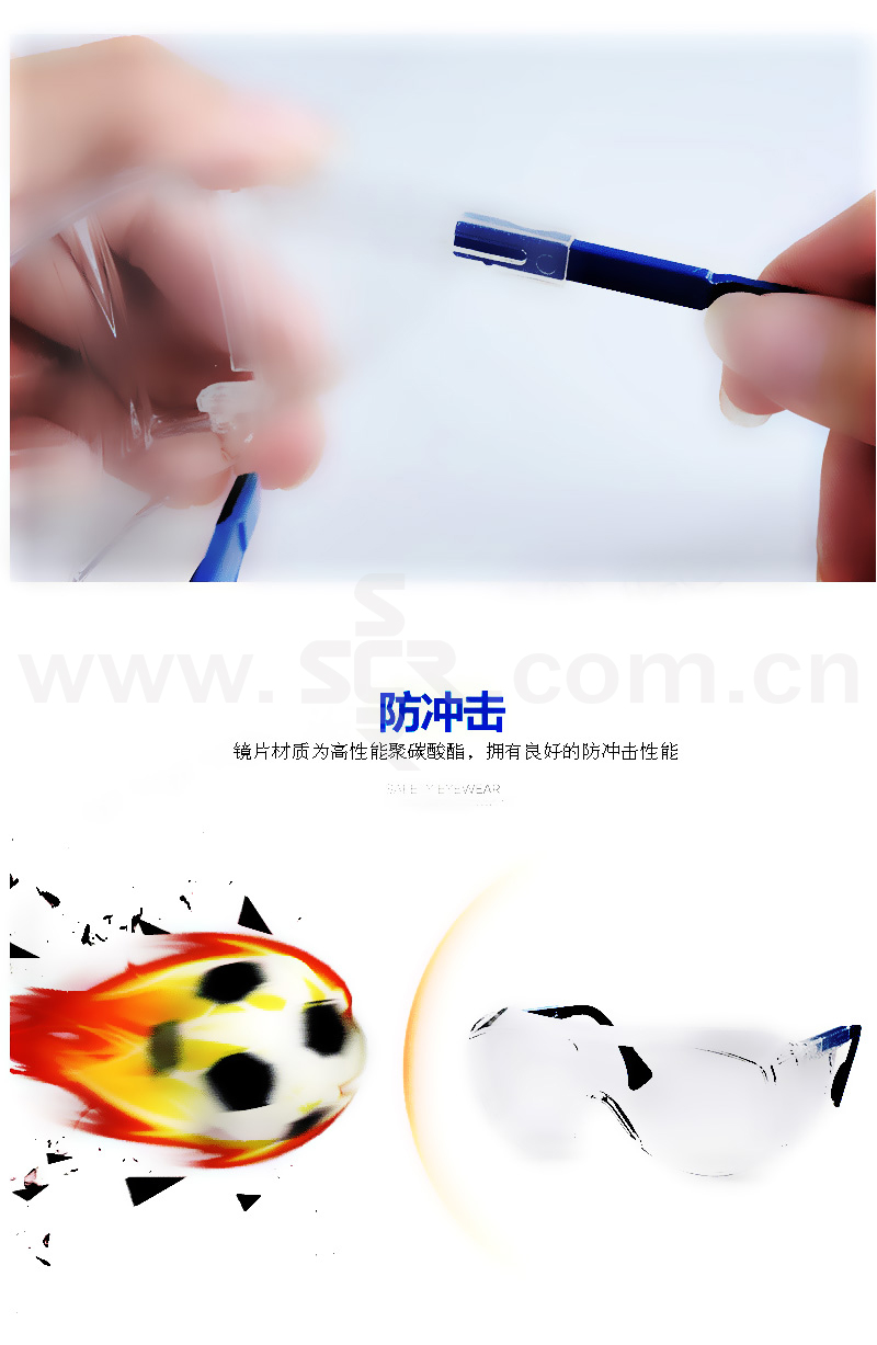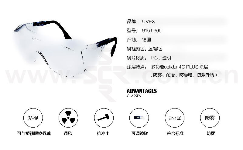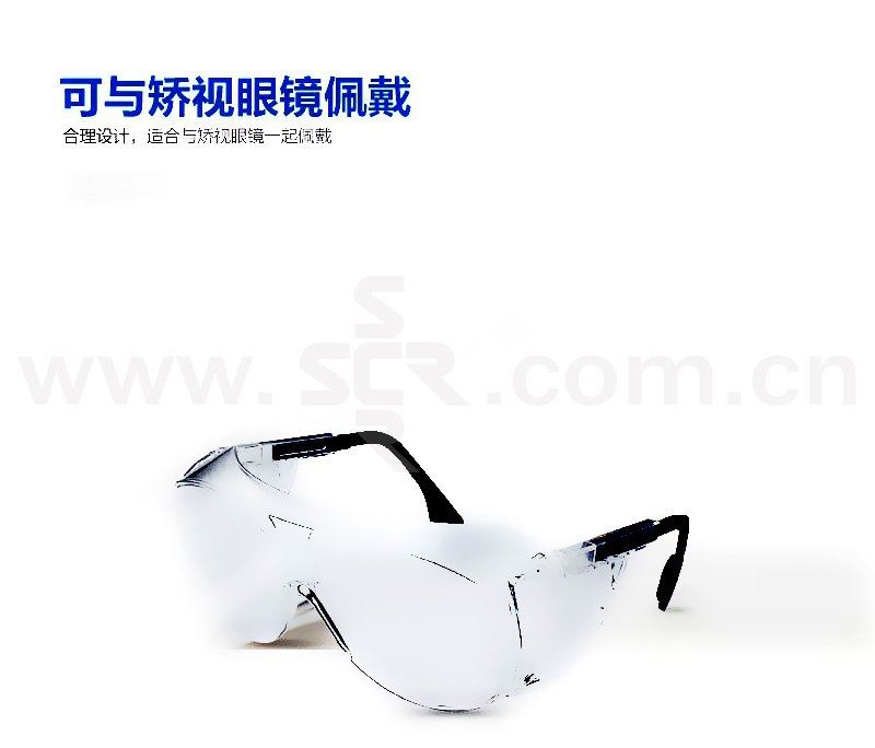 ·访客安全眼镜,可与矫视眼镜一起使用·镜框:透明·镜腿:蓝/黑色·镜片:透明·卓越加强涂层,内外侧防刮,很强防雾·全景式镜片,侧翼防护,为眼部周围提供大范围防护·镜腿可调节,适合不同脸型与头型的佩戴者·宽阔视野