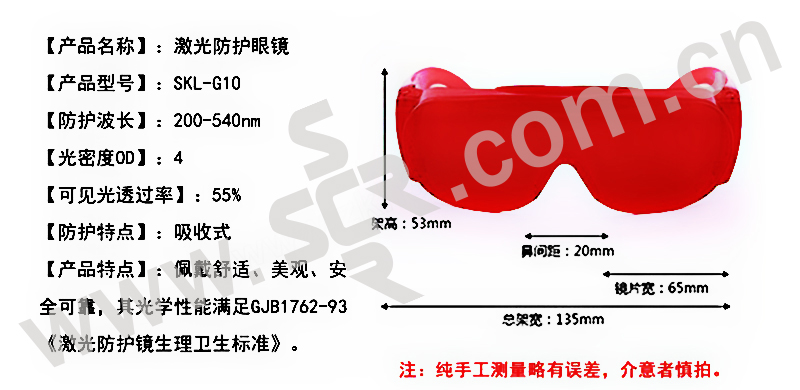 ·是一种高效安全的护目镜 ·适用于多种激光器 ·配戴舒适、美观、安全可靠 ·其光学安全性能完全满足GJB1762-93《激光防护镜生理卫生标准》 ·这款激光安全眼镜是反射式的,可全方位防护特定波段1064NM的激光和强光 ·可见光透过率达到85%以上,光密度为5。0以上,(OD+5,OD+6),衰减率较高(10-6·有CE认证和国家实验室检测报告