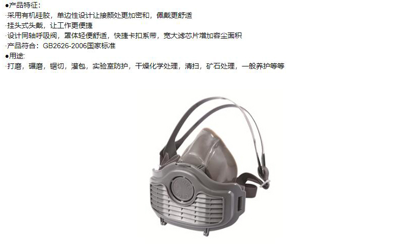 ·采用有机硅胶,单边性设计让接颜处更加密和,佩戴更舒适 ·挂头式头戴,让工作更便捷 ·设计同轴呼吸阀,罩体轻便舒适,快捷卡扣系带,宽大滤芯片增加容尘面积 ·产品符合:GB2626-2006国家标准