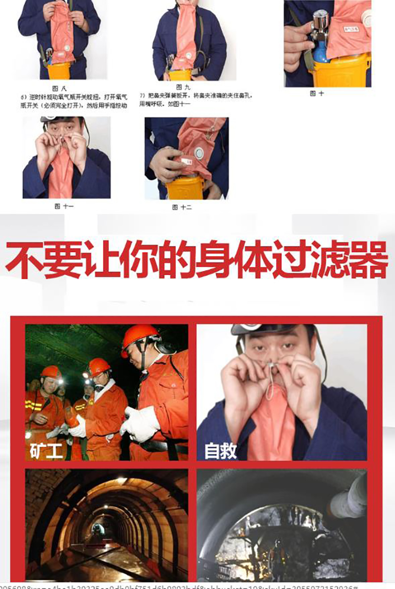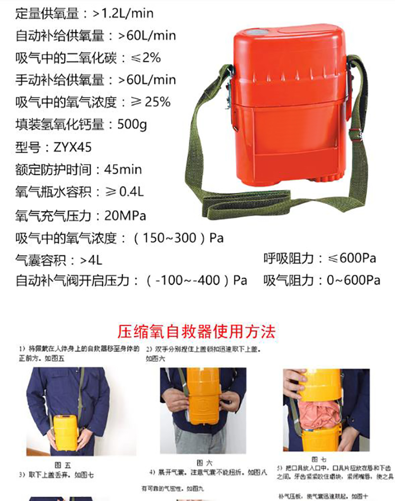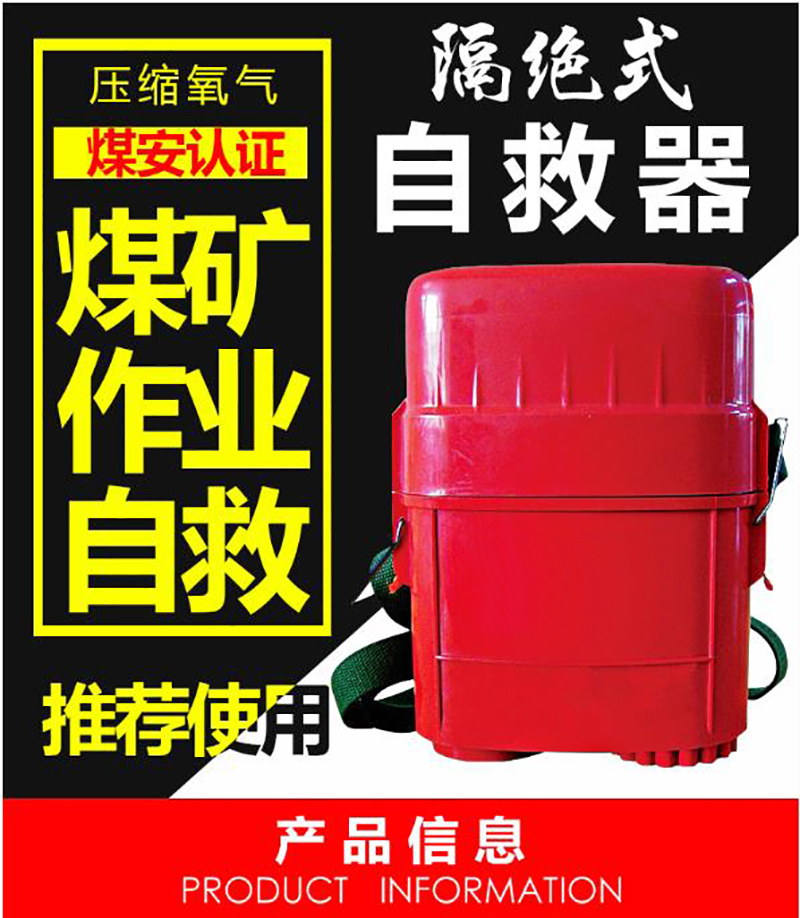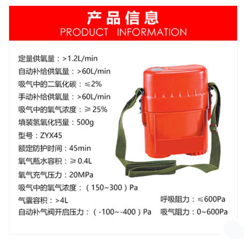 ·该产品是新一代大容量压缩氧气自救器,人体呼吸与外界完全隔绝,可以防止外界有毒有害气体吸入