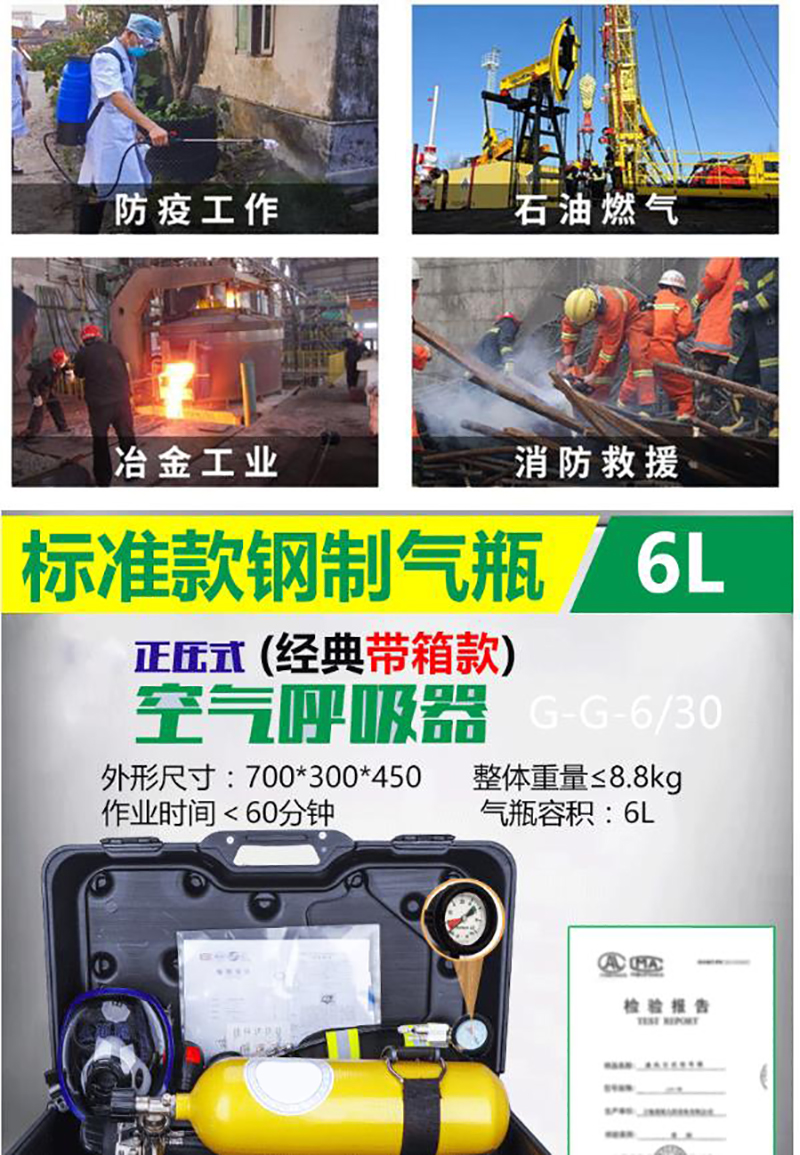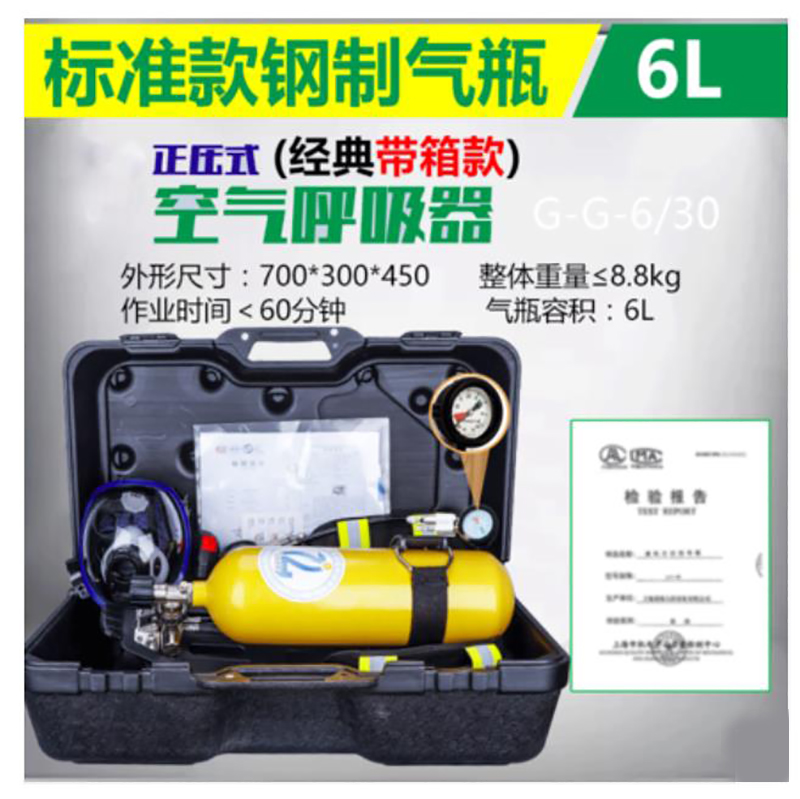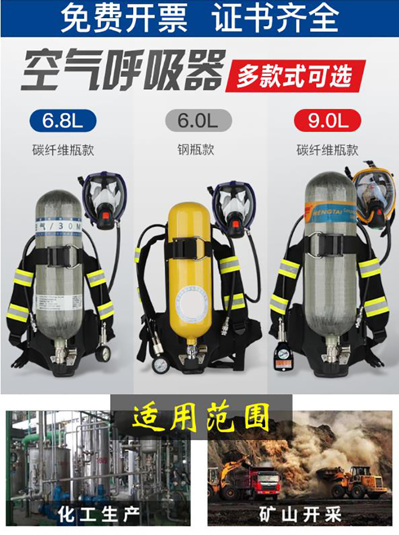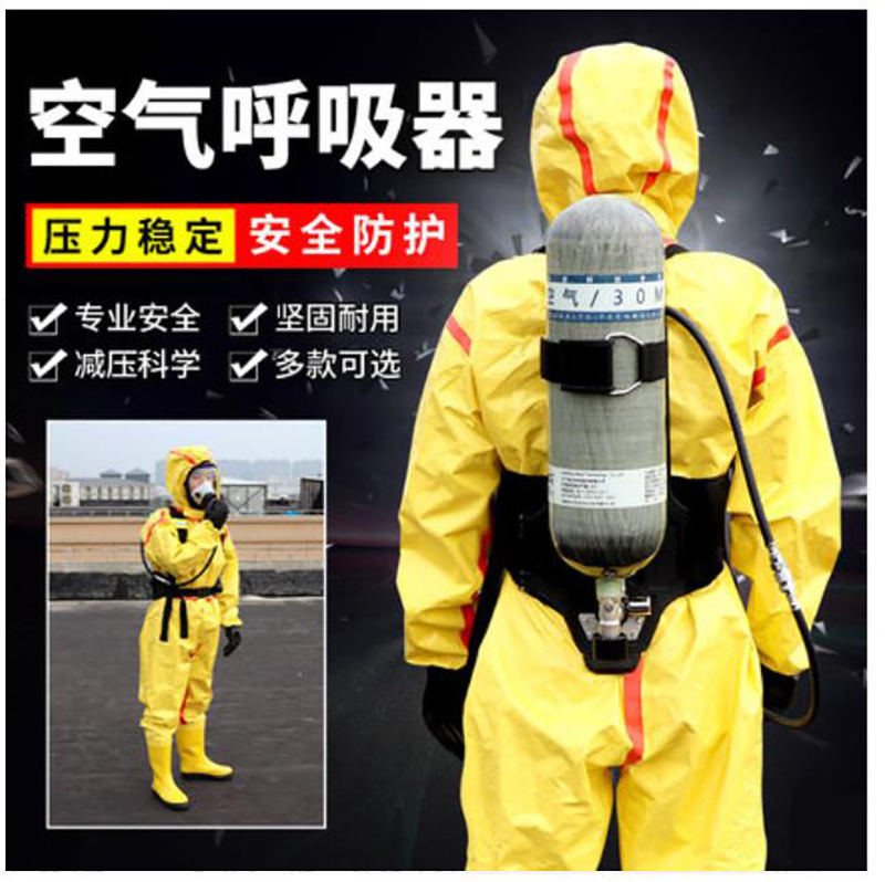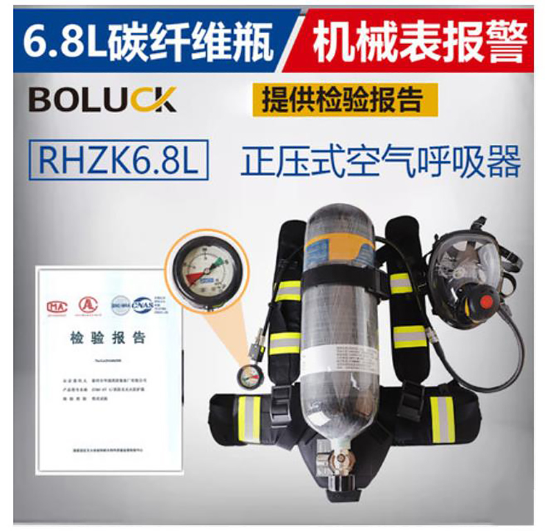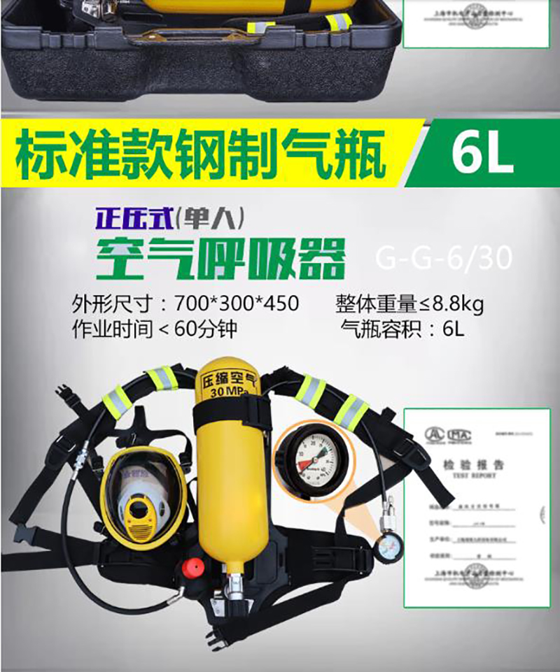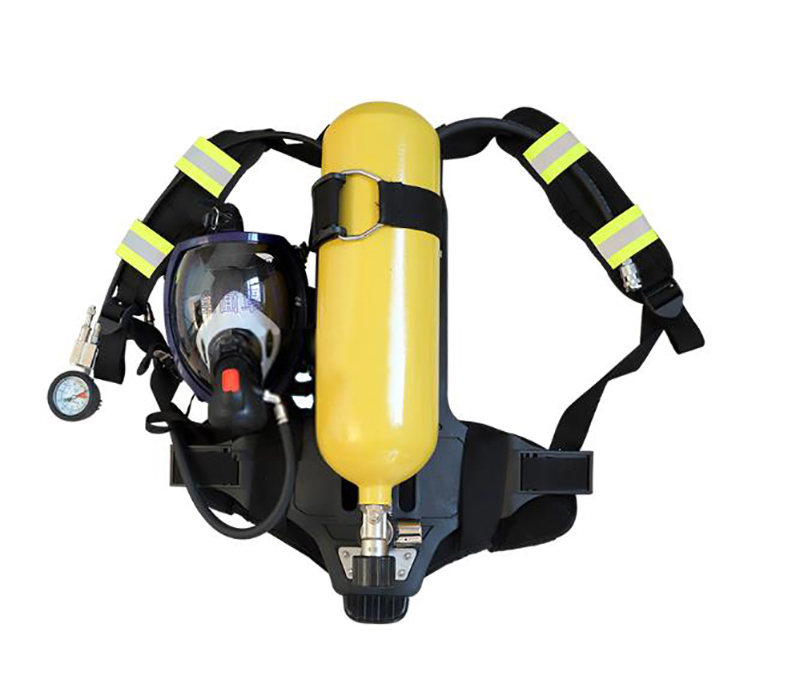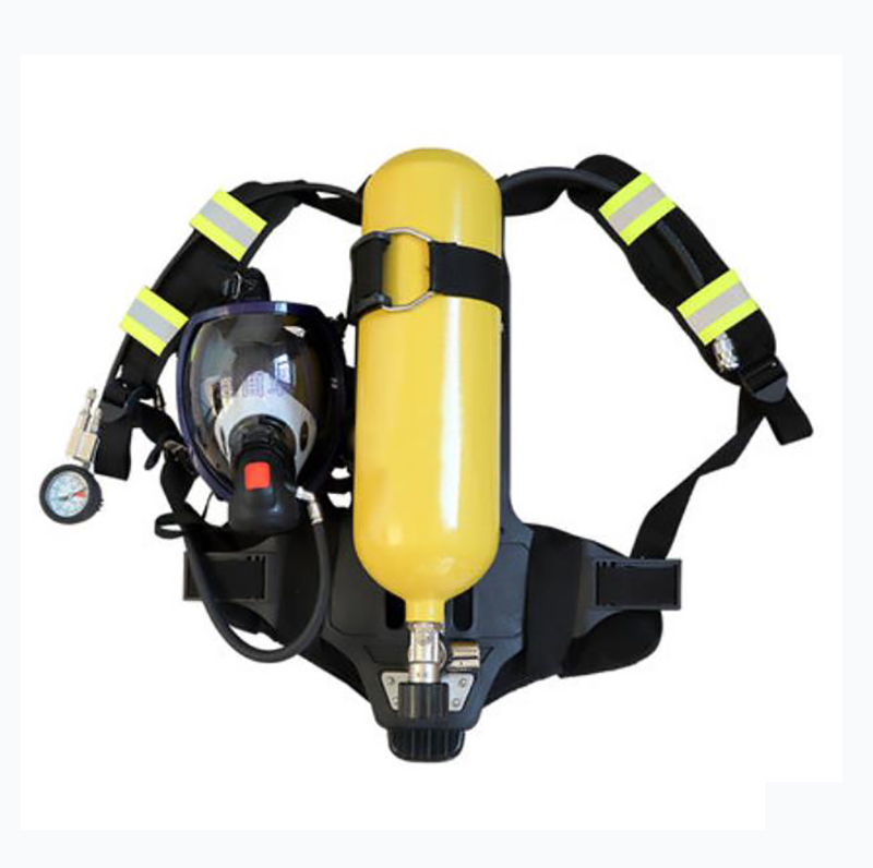 阻燃全面罩,具有防雾功能,球形面罩,视野率满足要求 背带及腰带采用芳纶材质,具有阻燃性能 ·6.8L碳纤维气瓶 气瓶质量轻,储气量大,配有阻燃保护套,配自锁瓶阀,防止意外关闭 ·供气阀外观黄色醒目,362度快速插接,操作方便,供气阀输出压力稳定,呼吸舒适度高