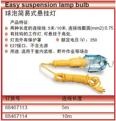 ·两种长度的连接线:5米/10米,连接线截面(mm2):0.75 ·有挂钩的工作灯,可悬挂于高处, ·灯泡外有保护罩 额定电压(V):250 E27接口,不含光源