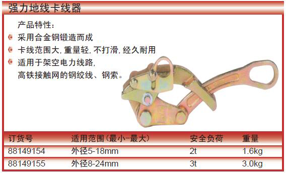 ·采用合金钢锻造而成 ·卡线范围大、重量轻、不打滑、经久耐用 ·适用于架空电力线路的绝缘导线、钢芯铝绞线、裸铝线。