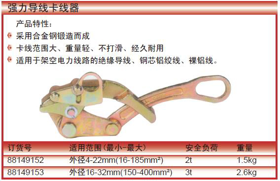 ·采用合金钢锻造而成 ·卡线范围大、重量轻、不打滑、经久耐用 ·适用于架空电力线路的绝缘导线、钢芯铝绞线、裸铝线。