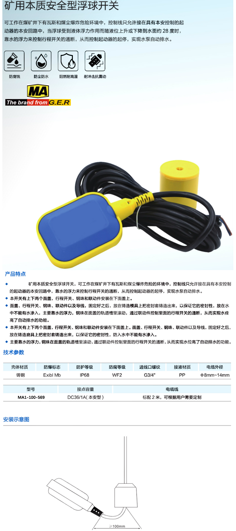 ·KHF-1C矿用本质安全型浮球开关,可工作在煤矿井下有瓦斯和煤尘爆炸危险的环境中,控制线只允许接在具有本安控制的起动器的本安回路中,靠水的浮力来控制行程开关的通断,从而控制起动器的起停,实现水泵自动排水。本开关有上下两个面盖,行程开关、钢珠和联动件安装在下面盖上。 面盖、行程开关、钢珠、联动件以及导线,固定好之后,放在铸造模具上把密封套铸造出来,以保证它的密封性,放在水中不能有水渗入,主要靠水的浮力,钢珠在面盖的轨道槽里滚动,通过联动件控制里面的行程开关的通断,从而实现水痊高了自动排水的功能。 本开关有上下两个面盖,行程开关、钢珠和联动件安装在下面盖上。面盖、行程开关、钢珠、联动件以及导线,固定好之后,放在铸造磨具上把密封套铸造出来,以保证它的密封性,防入水中不能有水渗入。 主要靠水的浮力,钢珠在面盖的轨道槽里滚动,通过联动件控制里面的行程开关的通断,从而实现水位高了自动排水的