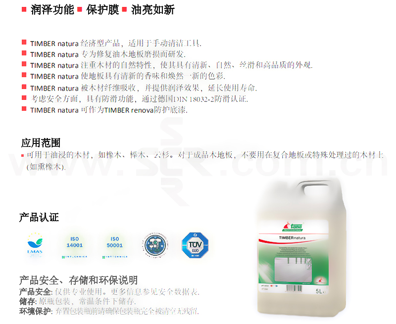·经济型产品,适用于手动清洁工具.·专为修复油木地板磨损而研发.·注重木材的自然特性,使其具有清新、自然、丝滑和高品质的外观·使地板具有清新的香味和焕然一新的色彩·被木材纤维吸收,并提供润泽效果,延长使用寿命.·TIMBER natura 可作为TIMBER renova防护底漆