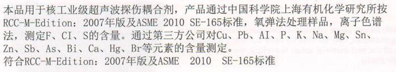 ·试片用于检验磁粉探伤设备本品用于核工业级超声波探伤耦合剂,产品通过中国科学院上海有机化学研究所按RCC-M-Edition: 2007年版及ASME 2010 SE-165标准,氧弹法处理样品,离子色谱法,测定F、CI、S的含量。 ·试片用于检验磁粉探伤设备通过第三方公司对Cu、Pb、AI、P、K、Na、Mg、Sn、Zn、Sb、As、Bi、Ca、Hg、Br等元素的含量测定。 ·符合RCC-M-Edition:2007年版及ASME 2010 SE-165标准