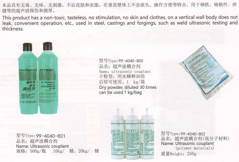 工业用超声波耦合剂是一种可以广泛应用于超声波探伤的耦合剂。 本品无毒、无刺激性、无异味、无色透明,对检测人员更安全;并且本配方无磷、澳、碘、硫等杂质元素,pH值中性,不腐蚀、损伤工件材料。 本配方包含作业期间防锈功能,防止使用期间锈蚀工件。本产品具有良好附着力,在斜面、垂直面处不易流失,方便操作。