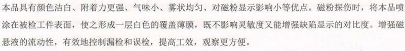 ·本品具有颜色洁白、附着力强、气味小、雾状均匀、对磁粉显示影响小等优点。磁粉探伤时,将本品喷涂在被检工件表面,使之形成一层白色的覆盖薄膜,既不影响灵敏度又能增强缺陷显示的对比度。 ·增强磁悬液的流动性,有效地控制漏检和误检,提高工效,观察更方便。