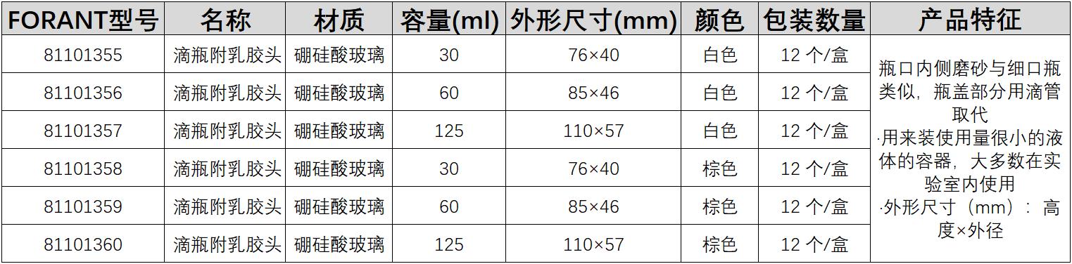 ·瓶口内侧磨砂与细口瓶类似,瓶盖部分用滴管取代 ·外形尺寸(mm):高度×外径