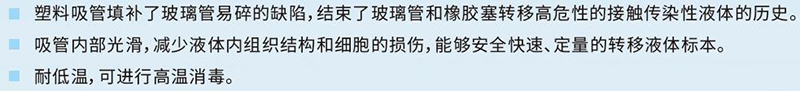 ·塑料吸管填补了玻璃管易碎的缺陷,结束了玻璃管和橡胶塞转移高危性的接触传染性液体的历史。 ·吸管内部光滑,减少液体内组织结构和细胞的损伤,能够安全快速、定量的转移液体标本。 ·耐低温,可进行高温消毒。