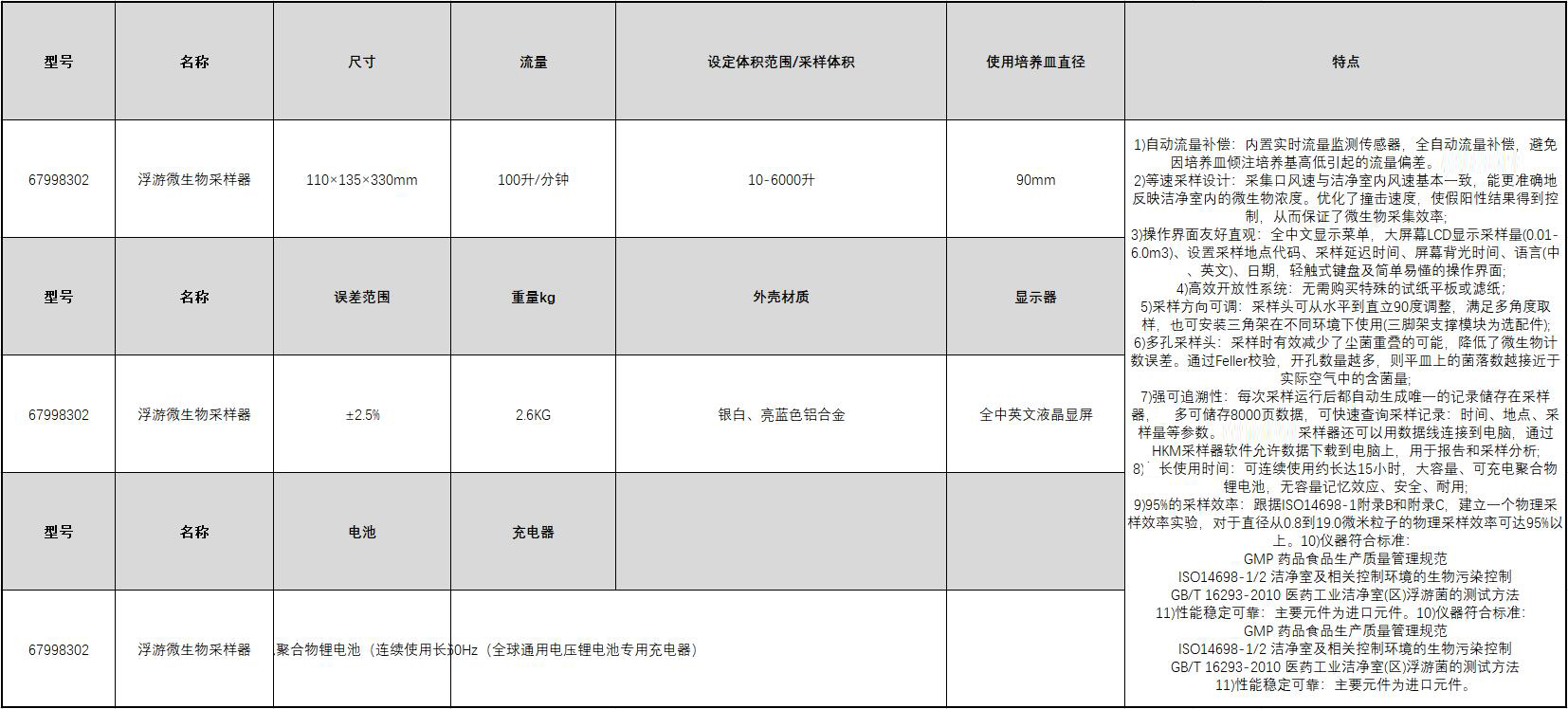 ·自动流量补偿:内置实时流量监测传感器,全自动流量补偿,避免因培养皿倾注培养基高低引起的流量偏差。(HKM-ⅡB型) ·等速采样设计:采集口风速与洁净室内风速基本一致,能更准确地反映洁净室内的微生物浓度。优化了撞击速度,使假阳性结果得到控制,从而保证了微生物采集效率; ·操作界面友好直观:全中文显示菜单,大屏幕LCD显示采样量(0.01-6.0m3)、设置采样地点代码、采样延迟时间、屏幕背光时间、语言(中、英文)、日期,轻触式键盘及简单易懂的操作界面; ·高效开放性系统:无需购买特殊的试纸平板或滤纸