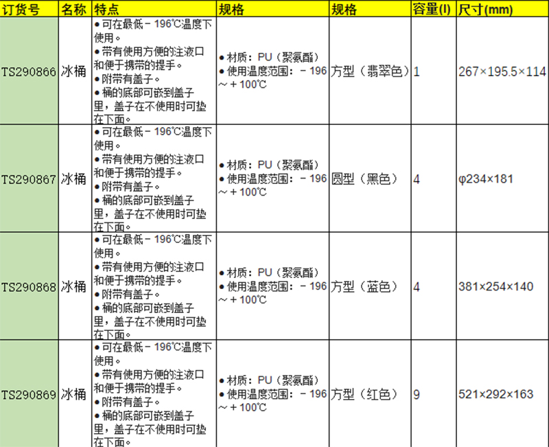 订货号 制造商型号 容量 尺寸 规格 材质 使用温度范围 价格 购物车