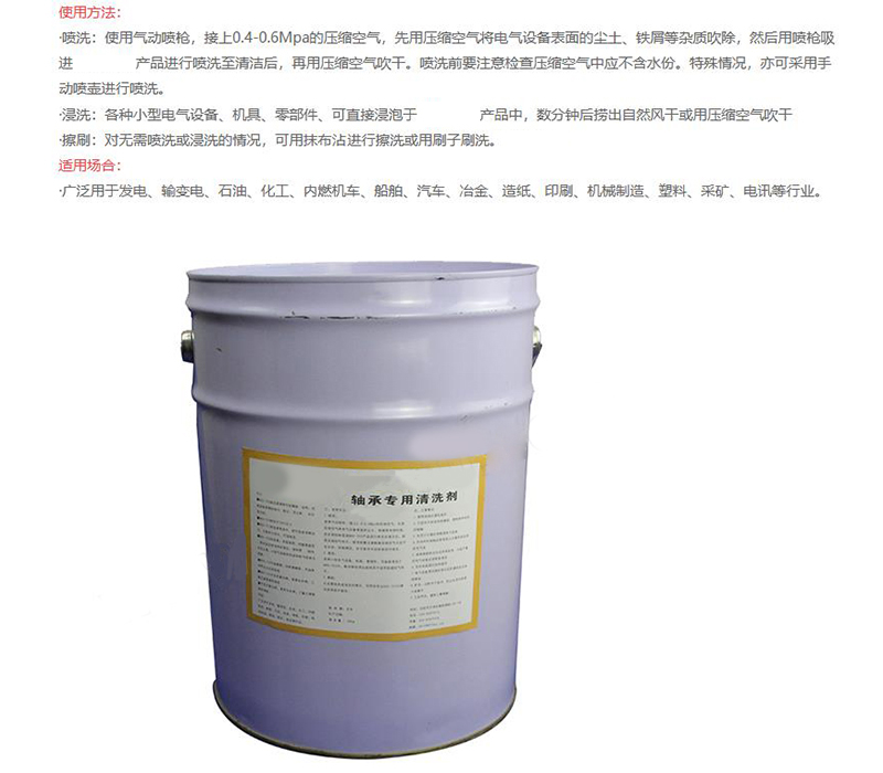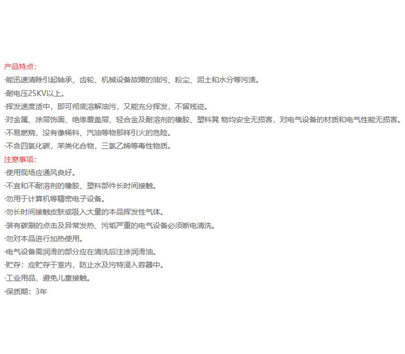 ·能迅速清除引起轴承、齿轮、机械设备故障的油污、粉尘、泥土和水分等污渍 ·耐电压25KV以上 ·挥发速度适中,即可彻底溶解油污,又能充分挥发,不留残迹 ·对金属、涂层饰面、绝缘覆盖层、轻合金及耐溶剂的橡胶、塑料凳 物均安全无损害,对电气设备的材质和电气性能无损害 ·不易燃烧,没有像稀料、汽油等物那样引火的危险 ·不含四氯化碳,苯类化合物,三氯乙烯等毒性物质