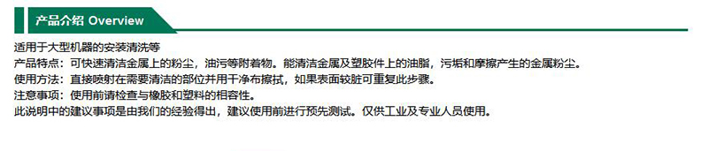 ·可快速清洁金属上的粉尘,油污等附着物,能清洁金属及塑胶件上的油脂,污垢和摩擦产生的金属粉尘