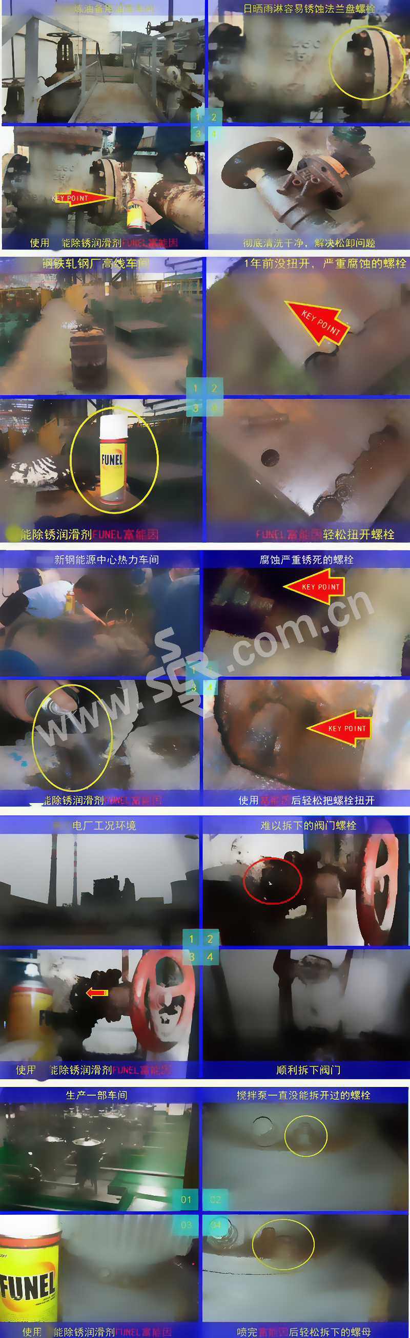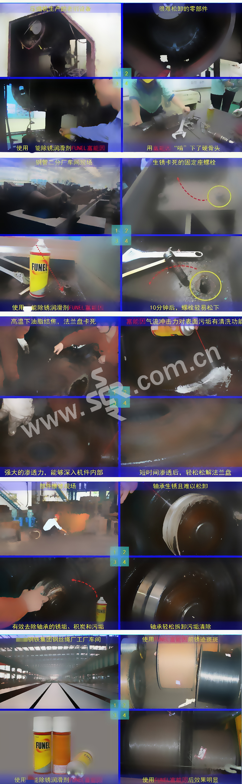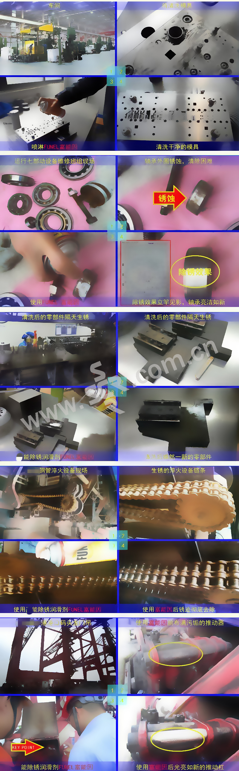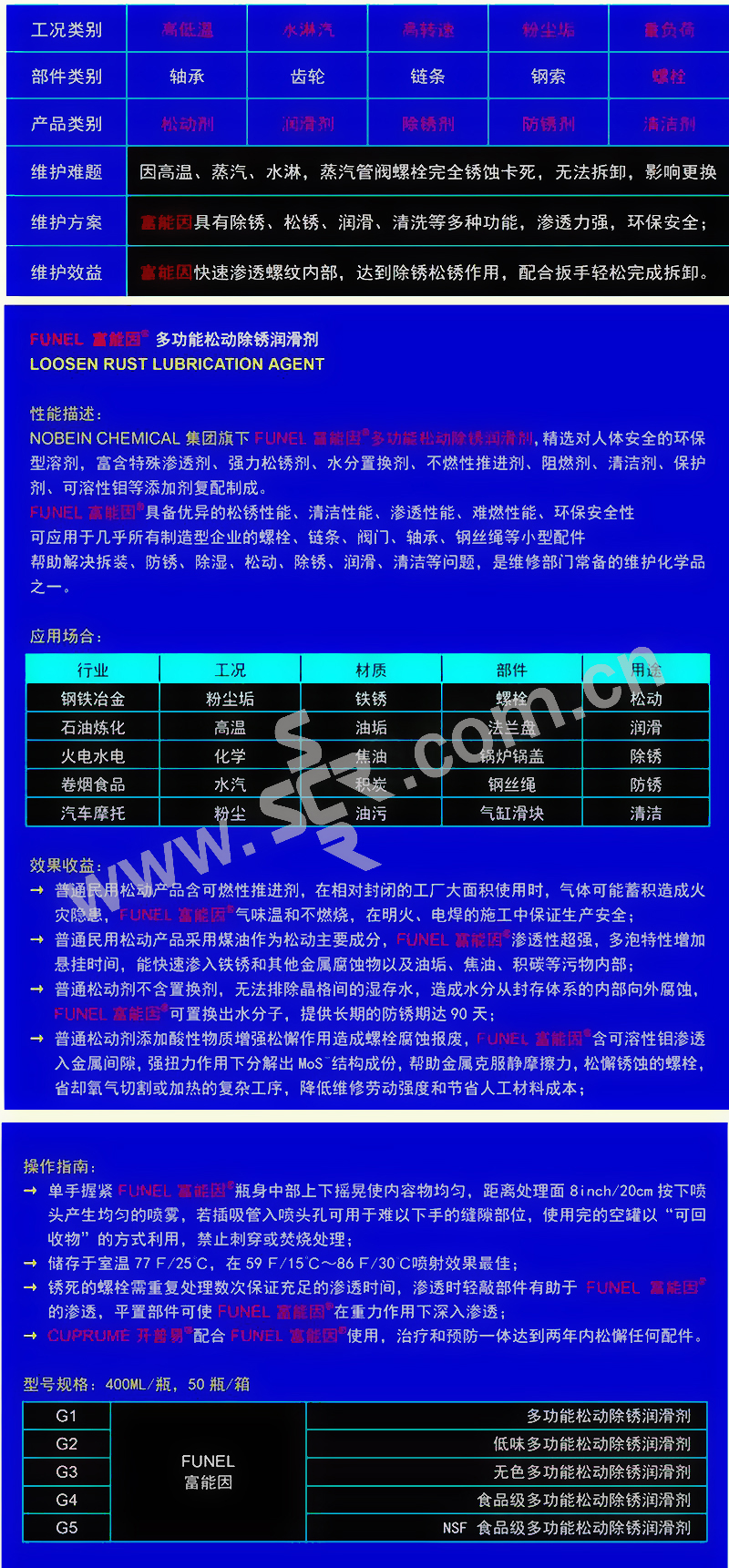 ·NSF认证级别,精选对人体安全的环保型溶剂,富含特殊渗透剂、强力松锈剂、水分置换剂、不燃性推进剂、阻燃剂、清洁剂、保护剂、可溶性钼等添加剂复配制成。·FUNEL富能因®具备优异的松锈性能、清洁性能、渗透性能、难燃性能、环保安全性·可应用于食品,医药,烟草企业的螺栓、链条、阀门、轴承、钢丝绳等小型配件,帮助解决拆装、防锈、除湿、松动、除锈、润滑、清洁等问题
