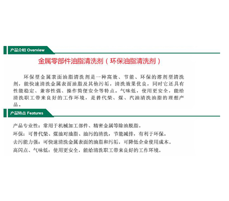 ·产品专业性:常用于机械加工部件、精密金属等除油脱脂。 ·环保:可替代柴、煤油对油脂、油污的清洗,节能减排,有利于环保。去污能力强:可快速清洗金属表面的油脂和污垢,可降低企业使用成本。高闪点、气味低:使用更安全,能给清洗职工带来良好的工作环境。