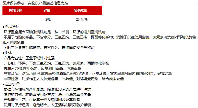·不属于危险化学品,不含水分、三氯乙烷、三氯乙烯、丙酮等化学物,消除了以往使用含氯、硫元素清洗剂对环境的污染和人体的危害