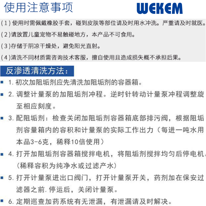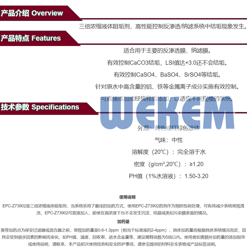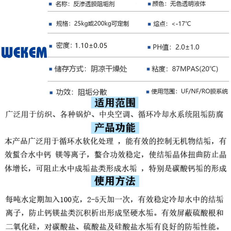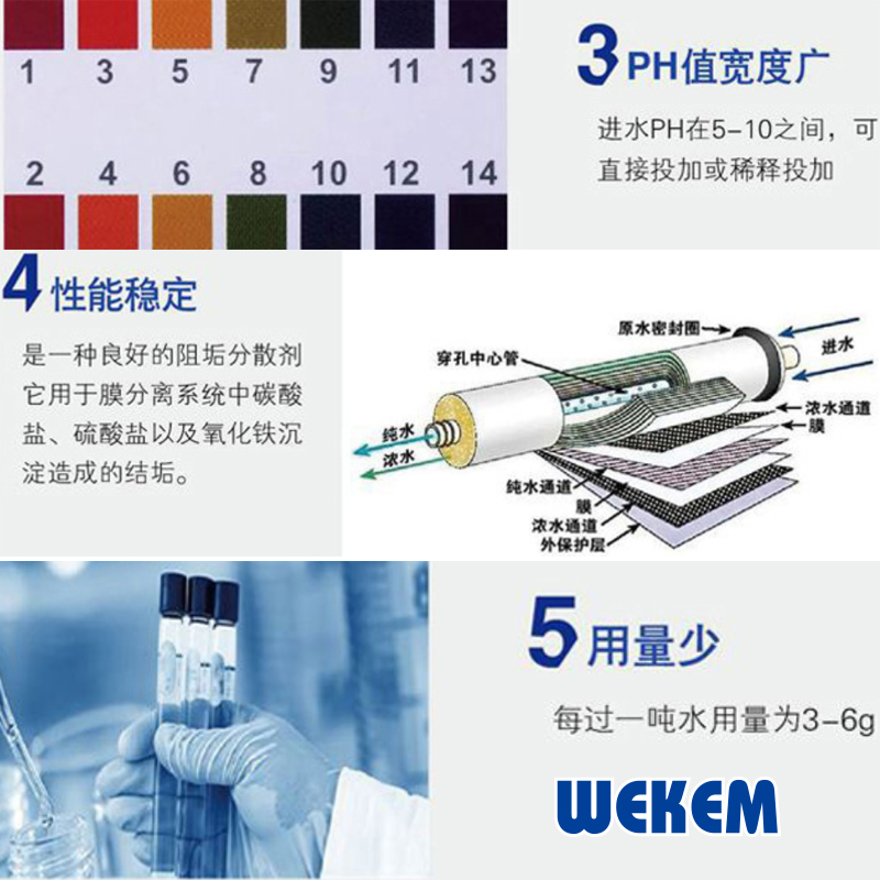 ·适合用于主要的反渗透膜,纳滤膜. ·有效控制CaCO3结垢,LSI值达+3.0还不会结垢. ·有效控制CaSO4,BaSO4,SrSO4等结垢. ·针对原水中高含量的铝,铁等金属离子成分实施有效控制. ·可直接添加或经稀释后添加,以适应不同规模的系统.