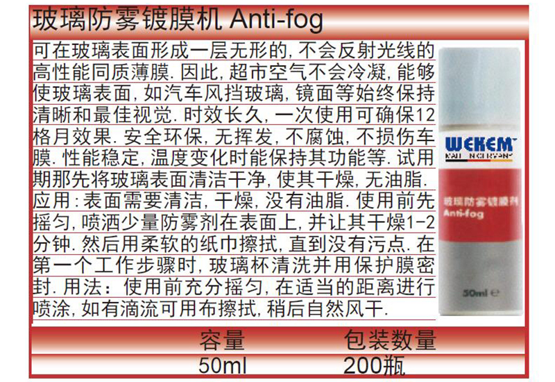 ·可在玻璃表面形成一层无形的,不会反射光线的高性能同质薄膜.因此,超市空气不会冷凝,能够使玻璃表面,如汽车风挡玻璃,镜面等始终保持清晰和最佳视觉.时效长久,一次使用可确保12格月效果.安全环保,无挥发,不腐蚀,不损伤车膜.性能稳定,温度变化时能保持其功能等.试用期那先将玻璃表面清洁干净,使其干燥,无油脂. ·应用:表面需要清洁,干燥,没有油脂.使用前先摇匀,喷洒少量防雾剂在表面上,并让其干燥1-2分钟.然后用柔软的纸巾擦拭,直到没有污点.在第一个工作步骤时,玻璃杯清洗并用保护膜密封.