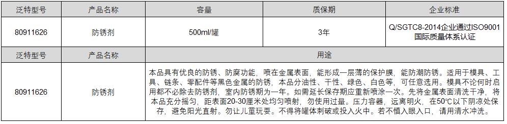 ·本品具有优良的防锈、防腐功能,喷在金属表面,能形成一层薄的保护膜,能防潮防锈。 ·适用于模具、工具、链条、零配件等黑色金属的防锈,本品分油性、干性、绿色、白色等,可任意选用。 ·模具不论何时启用都不必除去防锈剂,室内防锈期为一年。如需延长保存期应重新喷涂一次。 ·先将金属表面清洗干净,将本品充分摇匀,距表面20-30厘米处均匀喷射,勿使用过量。 ·压力容器,远离明火,在50℃以下阴凉处保存,避免阳光直射。 ·勿让儿童玩耍。不得将罐体刺破或投入火中。若不慎入眼入口,请用清水冲洗。