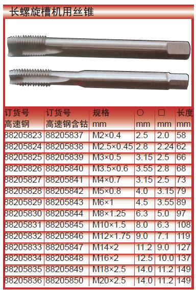 订货号 制造商型号 螺纹标准 总长度 螺距(牙数) 适宜加工材料 导程 精度等级 刀具材质 材质编码 方隼尺寸 夹持直径 价格 购物车