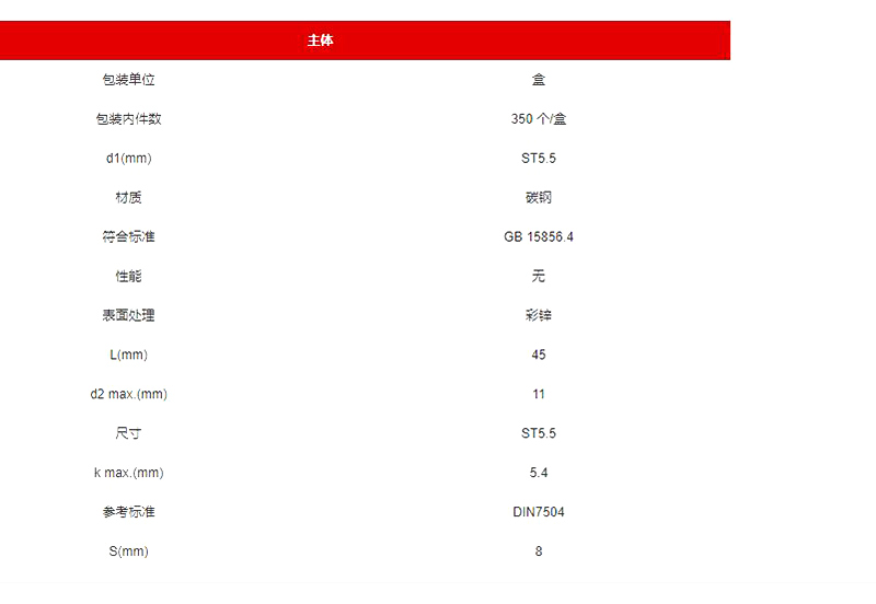 ·符合标准:GB15856.4·其他参照标准:~DIN7504K·材料:碳钢·芯部硬度:HV^#5/^#270~425·表面硬度:≥HV^#0.3/^#560·表面处理:彩锌(电镀)