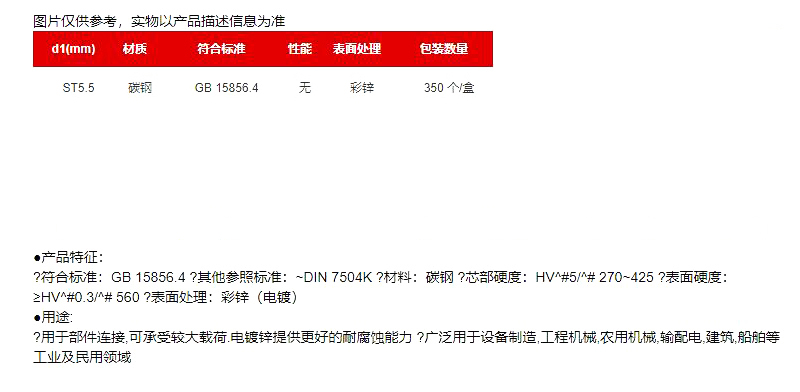 ·符合标准:GB15856.4·其他参照标准:~DIN7504K·材料:碳钢·芯部硬度:HV^#5/^#270~425·表面硬度:≥HV^#0.3/^#560·表面处理:彩锌(电镀)