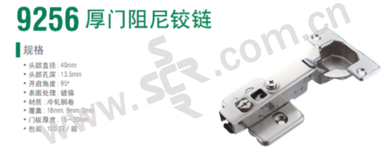 ·9256厚门缓冲铰链,不仅能安装30mm厚度门片并且能载负较重门片,二段式的设计使开门拉力减小,内置缓冲机构使开关顺畅且安静无声,安装时更是快捷,免拆装即可调整,是居家装潢升级家具的选择。